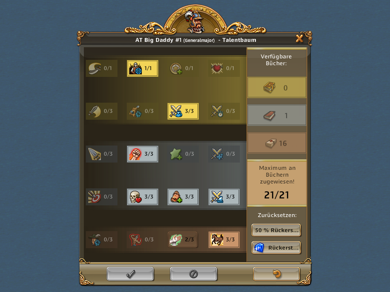 Blitzangriff sehe ich beim MAJOR sinnlos, genauso wie Extraleben, da der MAJOR im Grunde in einem AT nie absichtlich stirbt (wie ein Vorwellengeneral). Kopfgeldjäger würde zwar viele Sterntaler bringen, aber Meisterstratege macht bei Generälen mit sehr hoher Truppenkapazität wie Major/AZW einfach mehr Sinn.