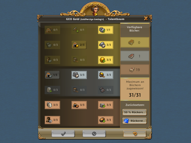 KEINE SKILLUNG ★ Geologe ★ Fröhlicher Geologe Da die beiden keine Spezialfähigkeiten haben und ich zig andere Geologen habe, kommen sie nicht mehr zum Einsatz und haben auch keine Skillung ★ Steinharter Geologe ★ Eiserner Geologe Steinharter und Eiserner machen nur mehr Sinn wer KEINE Geos mit Schatzfund (Fleissige oder Archäoloigsche) einsetzt. ★ Versierter Geologe Der Versierte ist mir unsymphatisch und bekommt bei mir auch keine Skillung *hrhrhrhr*